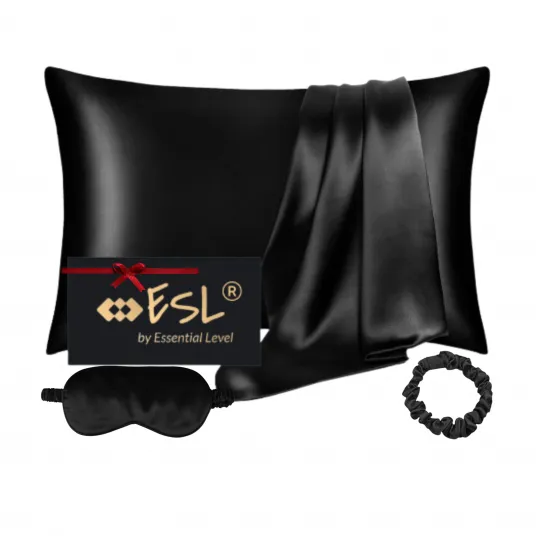 Set 2 Fete Perna Premium 6A Mulberry Silk 50x75 cm, Masca Ochi si Elastic Par ESL by Essential LevelВ®, 22mm Matase Naturala Ambele Fete Cerificata OEKO TEX Standard 100, Fermoar Ascuns, Black