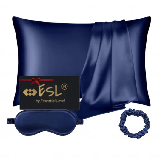 Set 2 Fete Perna Premium 6A Mulberry Silk 50x75 cm, Masca Ochi si Elastic Par ESL by Essential LevelВ®, 22mm Matase Naturala Ambele Fete Cerificata OEKO TEX Standard 100, Fermoar Ascuns, Navy Blue