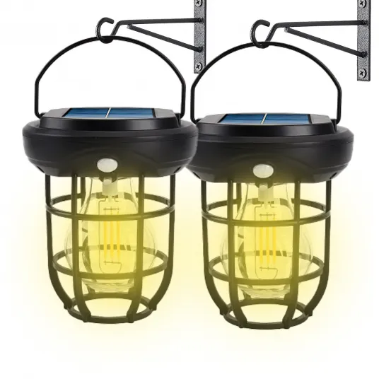 Set 2 lampi solare suspendate, EXCITAT®, Inox/Aluminiu, 3 moduri de iluminare, Cu incarcare solara, senzor de miscare, IP65, 14×16×14 cm, alimentat cu energie solara, pentru curte, gradina In aer liber, Negru