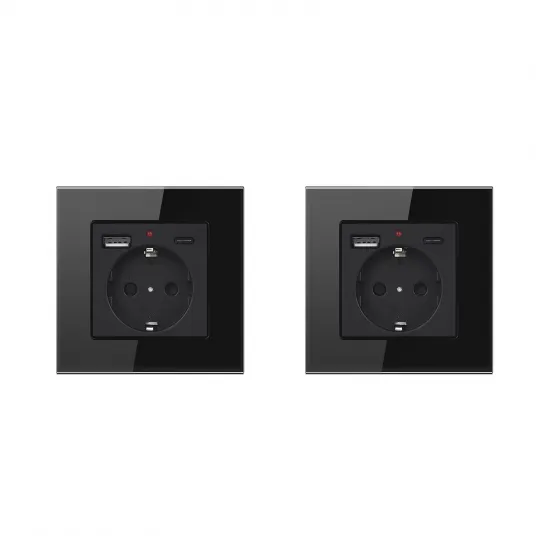 Set 2 Priza simpla, SINBINTA, 5V 2.1A, 250V, 20W, Curent maxim de sarcina 16A, Cu indicator luminos, Rama din sticla, USB A+TypeC, Cel incastrat, Pentru aparatele electrocasnice conventionale, ABS, 86 x 86mm, Negru