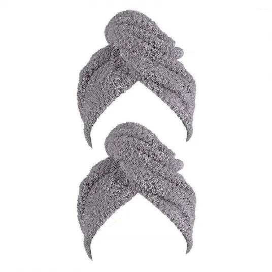 Set 2 prosop pentru uscat parul din microfibra, NUODWELL, Cu nasture pentru fixare, Pentru adulti si copii, Pufos si moale la atingere, Uscare rapida, Pentru acasa, sala de sport, calatorii, camping, 65 x 25 cm, Gri