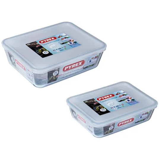 Set 2 vase rectangulare Pyrex, cu capac, sticla termorezistenta, 22 x 17 x 6 cm, 1.5 L + 25 x 19 x 8 cm, 2.6 L