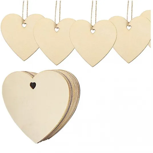 Set 20 placute decorative in forma de inima, lemn, pentru pictat, 10x10cm, cu sfoara