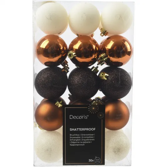 Set 30 globuri Craciun Decoris, diametru glob 6 cm, plastic, finisaje diverse, maro/bej