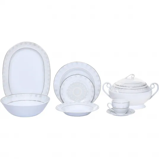 Set 34 piese Dinova Narbon portelan cu margini aurii, 6 farfurii intinse, 6 farfurii adanci, 6 farfurii desert, 6 cesti cu 6 farfurii, 1 platou, 1 bol salata, 1 supiera cu 1capac