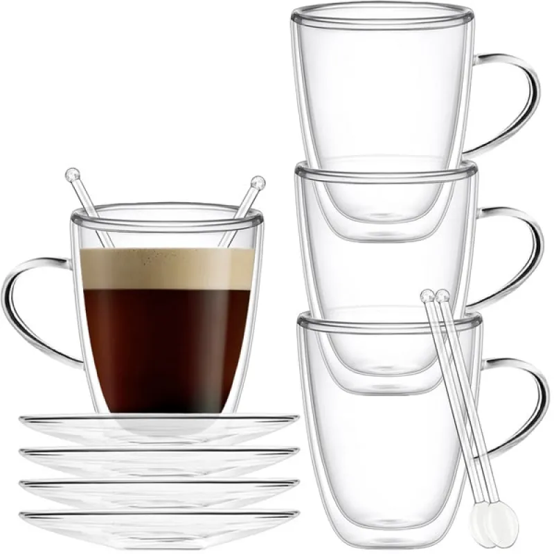 Set 4 cani si 4 farfurioare si 4 lingurite, Quasar & Co., farfurioara 10.5 cm, cana 350 ml cu pereti dubli, termorezistent, transparent