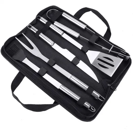 Set 5 ustensile pentru gratar, Cu husa de transport neagra, Otel inoxidabil, Argintiu