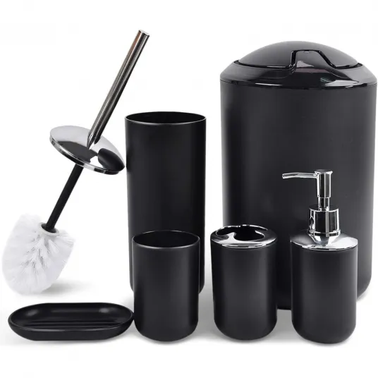Set 6 accesorii pentru baie, dispenser sapun lichid, suport periute si pasta de dinti, sapuniera, perie de toaleta cu suport, cos de gunoi, plastic, negruSet 6 accesorii pentru baie, dispenser sapun lichid, suport periute si pasta de dinti, sapuniera, perie de toaleta cu suport, cos de gunoi, plastic, negru223221286223221286