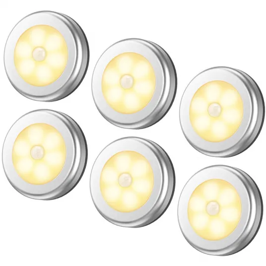 Set 6 Lampi led smart cu senzor de miscare wireless, ijoynewk, Funny and Joy, pentru dressing, dulap de bucatarie, baie, hol, scari, lumina calda, argintiu