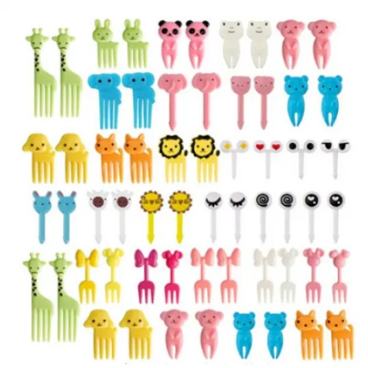Set 60 buc mini furculite si scobitori decorative pentru tort, JENUOS®, pentru copil, model animale, ocazii festive copii, modele cu animale, Multicolor