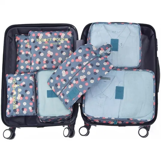 Set 7 organizatoare pentru imbracaminte/incaltaminte, GOGOU®, Poliester, pentru Valiza, Troler, imprimeu margareta, Albastru