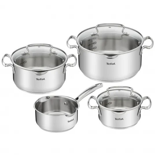 Setul de inductie Tefal Duetto Plus este realizat cu cea mai mare precizie si atentie la detalii, asigurand o calitate exceptionala si durabilitate de lunga durata. Fabricat din otel inoxidabil de calitate superioara, acest set de vase de gatit este rezistent la rugina, coroziune si deformare, facandu-l o investitie perfecta pentru bucatarie.