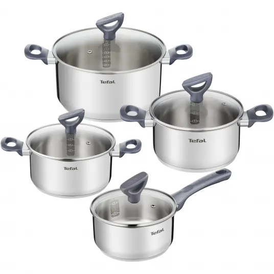 Set 8 piese Tefal Daily Cook, inductie, cratita de 16 cm, oala de 18/20/24 cm, 4 capace de sticla cu design inteligent, manere ergonomice, interior gradat, inox premium, argintiu
