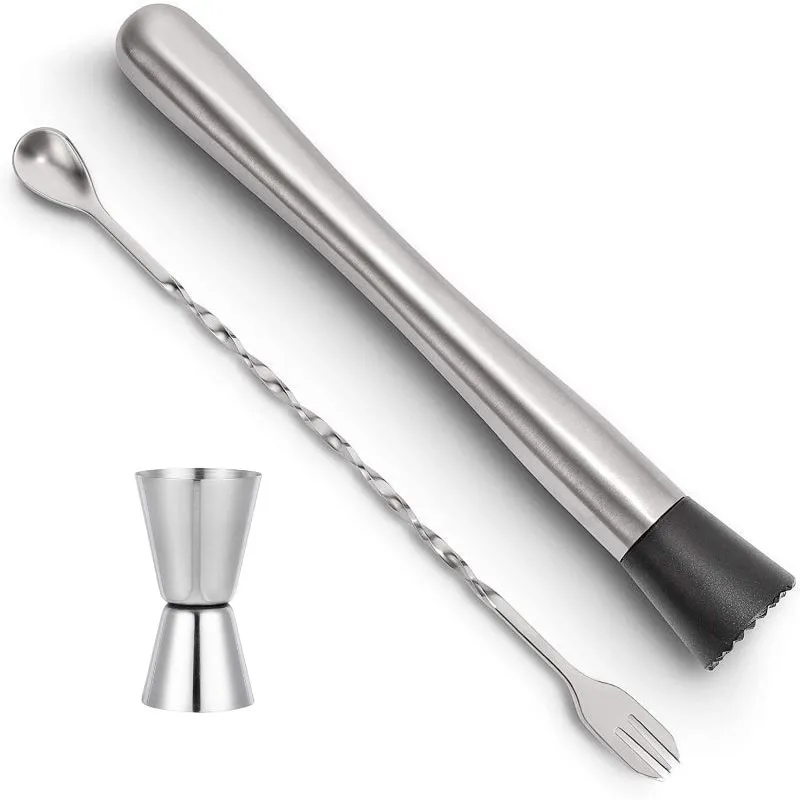 Set Accesorii Cocktail Lingura de bar cu maner lung rasucit 26cm, SOOYE® muddler si jigger masura dozatoare din inox, 3 piese