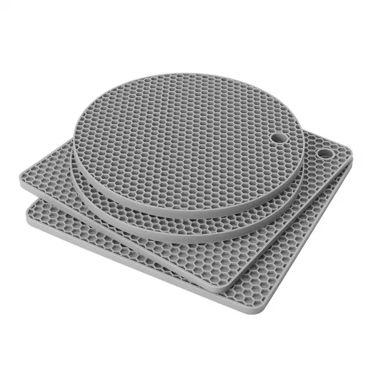 Set Accesorii din Silicon pentru Bucatarie format din 4 piese, Hggzeg, Suport oale fierbinti, Protectie Masa si Blat, Scurgator Vase si Manusi Termoizolante 225В°C culoare Gri, Rotunda, Patrata, 17.5/18.2cm