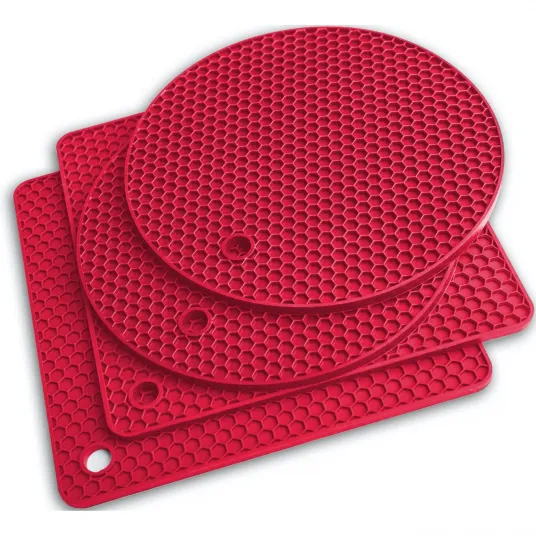 Set Accesorii din Silicon pentru Bucatarie Q’s INN format din 4 piese: Suport oale fierbinti, Protectie Masa si Blat, Scurgator Vase si Manusi Termoizolante 225°C culoare Rosu