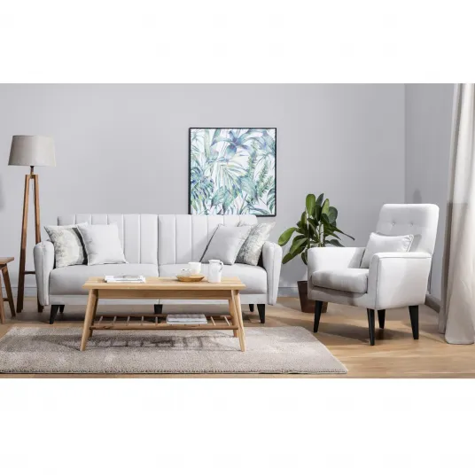 Cu o culoare crem atemporala, setul nostru de canapea-pat adauga o nota de eleganta oricarei incaperi. Designul elegant si picioarele din lemn ii sporesc atractivitatea vizuala, facandu-l un accesoriu perfect atat pentru interioarele moderne, cat si pentru cele traditionale.