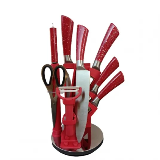 Set cutite bucatarie 9 piese din otel inoxidabil pentru feliere, taiat carne, fructe si legume, pentru dezosat si tocat, foarfece, curatator de coaja, masat pentru ascutit cutite in suport rotativ, Rosu