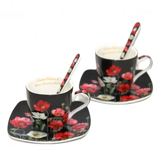 Set de 2 cesti din portelan, cu farfurii si lingurite, flori de macSet de 2 cesti din portelan, cu farfurii si lingurite, flori de mac701880493701880493