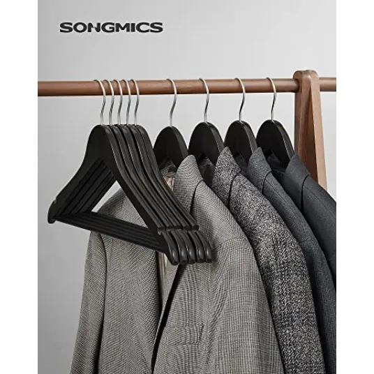 Set de 20 umerase din lemn, Songmics, Negru, 44.5x23x1.2 cm[Umerase din lemn masiv] Aceste umerase elegante din lemn masiv au o suprafata neteda, lustruita manual, care nu va va deteriora hainele, pastrandu-le in forma optima.<br><br>[Rezistenta durabila] Fabricat din lemn de artar de inalta calitate, aceste umerase sunt puternice si durabile si pot atarna haine din toate anotimpurile, inclusiv jachete de iarna sau haine care cantaresc pana la 5 kg.<br><br>[Agatare fara lovituri] Nu mai exista umeri jenanti in umerii costumelor dvs.; aceste umerase din lemn sunt curbate pentru a imita umerii dvs. si au grija de hainele dvs. delicate.<br><br>[Carlige pivotante] Carligele metalice de inalta calitate de pe aceste umerase de haine se rotesc la 360 °, astfel incat, chiar daca va atarnati accidental hainele in directia gresita, acestea pot fi schimbate cu usurinta.<br><br>[Antiderapant si cadou] Fantele anti-alunecare in forma de U si o bara de pantaloni anti-alunecare impiedica alunecarea hainelor si a pantalonilor; de asemenea, puteti face din cuierul de haine un cadou unic pentru familie si prieteni.224186733224186733
