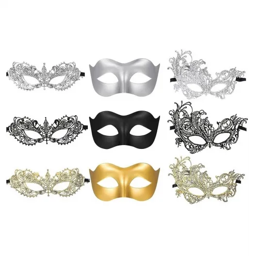 Set de 9 masti pentru costume de Halloween Cosplay, dantela/plastic, auriu fierbinte/negru/argintiu fierbinte, carrlinechoo®