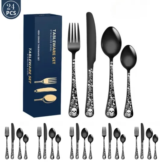 Set de argintarie cu craniu negru, set de tacamuri cu schelet, set de argintarie de Halloween, design unic gotic cu model de craniu, argintarie neagra din otel inoxidabil, se poate spala in masina de spalat vase (24, negru)