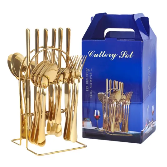 Set de articole de masa din otel inoxidabil cu suport agatat cutie cadou, aur, 24 bucSet de articole de masa din otel inoxidabil cu suport agatat cutie cadou, aur, 24 buc702034022702034022