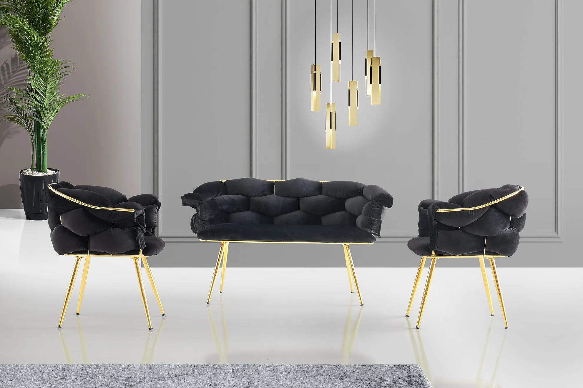 Cu combinatia eleganta de culori negru si auriu, setul nostru de canapele emana rafinament si frumusete atemporala. Designul elegant completeaza fara efort orice stil de interior, facandu-l un accesoriu perfect pentru casa ta. Indiferent daca aveti un decor modern sau traditional, acest set de canapea se va integra perfect si va deveni punctul central al camerei dvs. de zi.