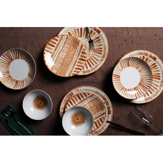 Fabricat din portelan 100%, acest set de cina emana un farmec atemporal care va va ridica masa de luat masa la noi culmi de eleganta. Combinatia de culori maro si alb adauga o nota de rafinament, facand din fiecare masa un festin pentru ochi.