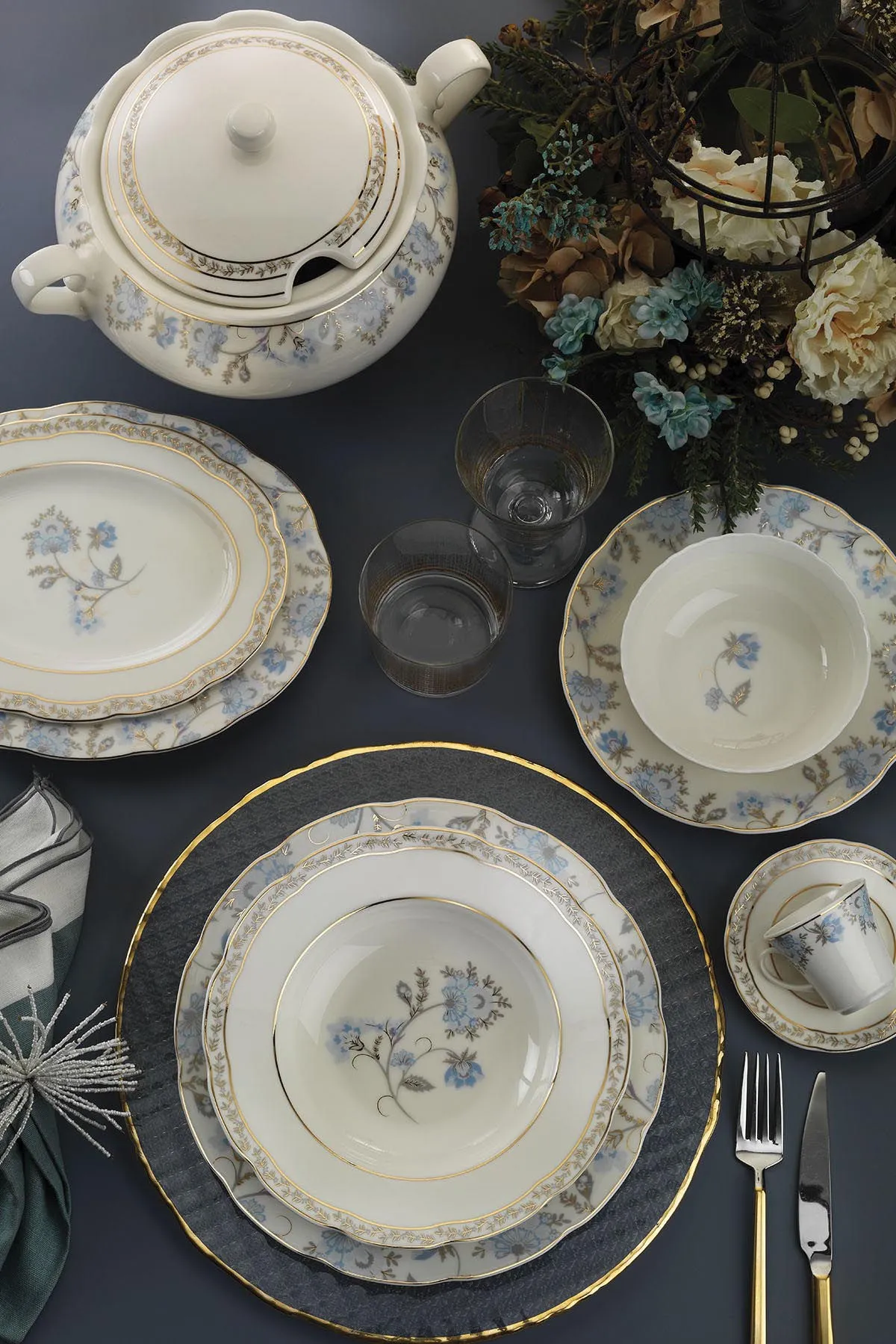 Setul de cina prezinta o combinatie uimitoare de accente albastre si aurii, adaugand o nota regala mesei dvs. Modelele complicate si detaliile delicate fac din fiecare piesa o opera de arta, care cu siguranta va va impresiona oaspetii si va crea o impresie de durata.