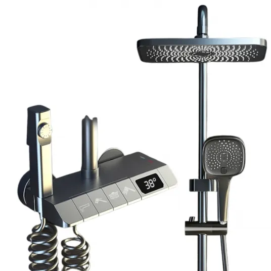 Set de dus cu para dreptunghiulara, afisaj digital, montare perete, 4 functii de curgere a apei, dus tip ploaie, dus de mana, design modern, sistem de dus, crom