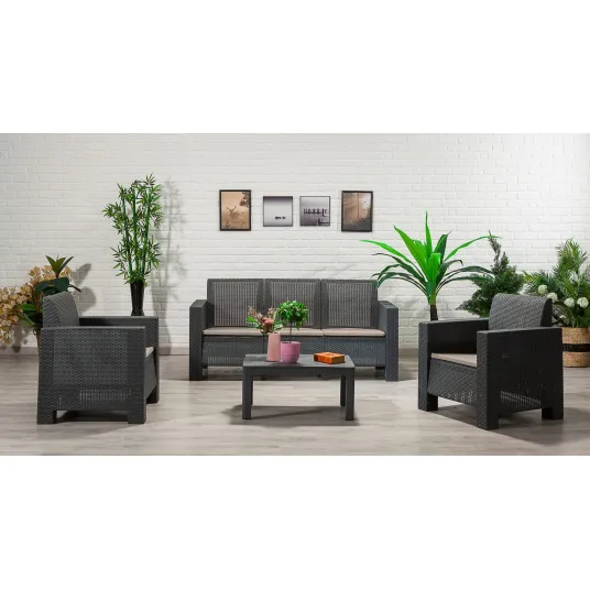 Culoarea antracit a acestui set de lounge adauga o nota moderna oricarui spatiu in aer liber. Fie ca aveti o terasa mare sau un balcon confortabil, acest set va ridica decorul dvs. de exterior si va va impresiona oaspetii.