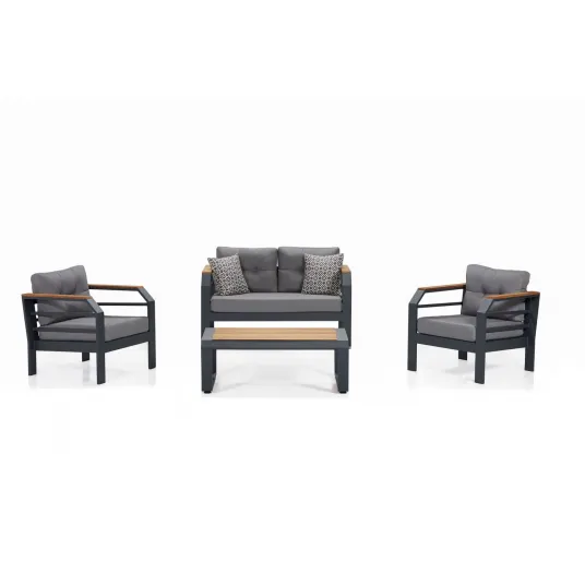 Cu un design industrial elegant, setul nostru de lounge de gradina se imbina fara efort cu orice estetica de exterior. Combinatia de culori gri si negru adauga o nota de rafinament, in timp ce varful de copac iriko al mesei de cafea adauga un element natural la aspectul general. Indiferent daca aveti o gradina moderna sau traditionala, acest set va spori frumusetea spatiului dvs. de exterior.