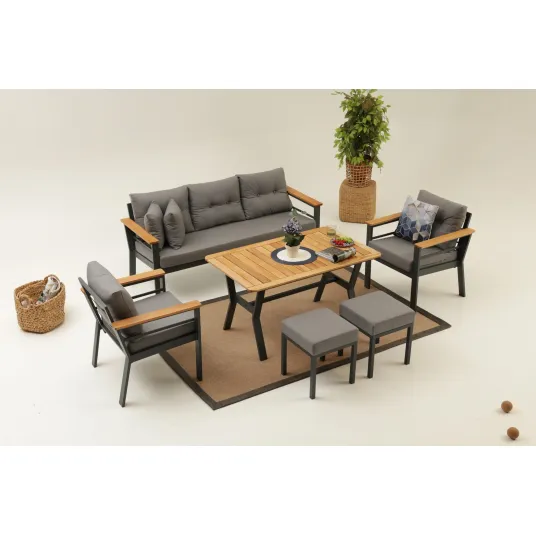 Pasiti in propria oaza personala cu setul nostru de lounge de gradina. Fabricat din lemn de carpen 100% si cadru metalic, acest set nu este doar durabil, ci emana si eleganta si rafinament.