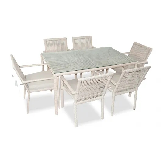 Cadrul setului nostru de lounge de gradina este fabricat din aluminiu 100%, asigurand o rezistenta si o longevitate exceptionale. Acest material de inalta calitate nu este doar usor, ci si rezistent la rugina si coroziune, ceea ce il face perfect pentru utilizarea in aer liber. Blatul mesei este confectionat din sticla 100% calita, adaugand o nota de eleganta designului general.