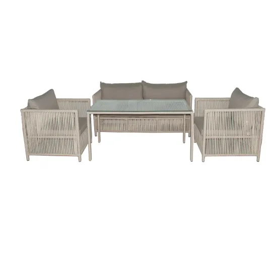 Confectionat cu un cadru din aluminiu 100%, setul nostru de lounge este construit pentru a rezista testului timpului. Constructia sa robusta asigura stabilitate si longevitate, permitandu-va sa va bucurati de nenumarate momente de relaxare si seninatate. Blatul mesei, realizat din sticla 100% calita, adauga o nota de eleganta si rafinament la designul general.