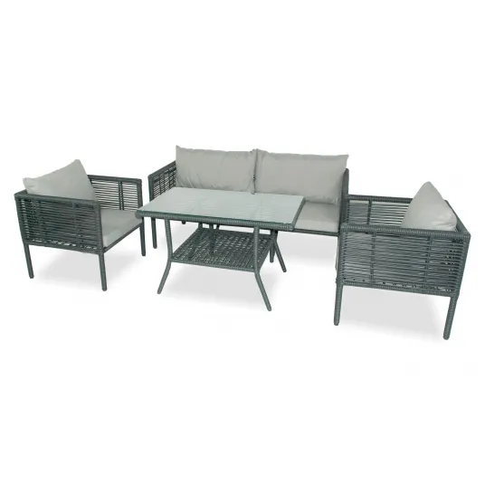 Cu un design elegant si modern, setul nostru de lounge se imbina fara efort cu orice decor de exterior. Culoarea gri adauga o nota de rafinament, creand o atmosfera eleganta si primitoare. Fie ca aveti o terasa spatioasa sau un balcon confortabil, setul nostru versatil se potriveste perfect in orice spatiu, fiind ideal atat pentru intalniri mari, cat si pentru momente intime.