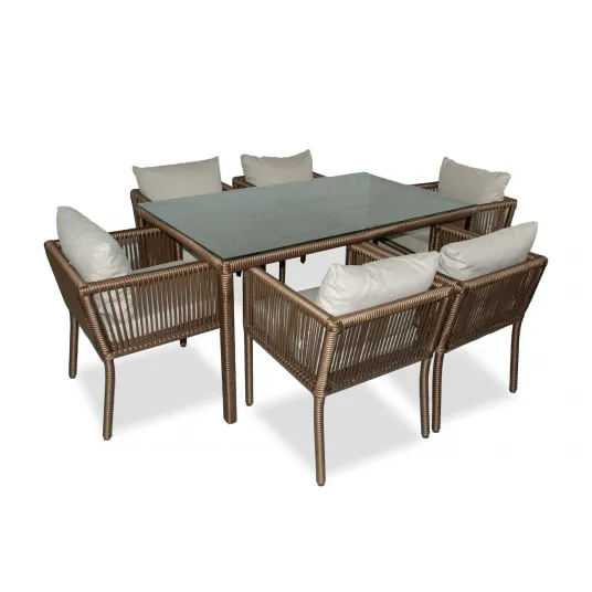 Cu cele sase scaune incluse in set, va puteti invita prietenii si familia la dvs. pentru o dupa-amiaza relaxanta la soare. Designul ergonomic al scaunelor asigura un confort maxim, permitandu-va sa va asezati pe spate si sa va bucurati de seninatatea imprejurimilor.