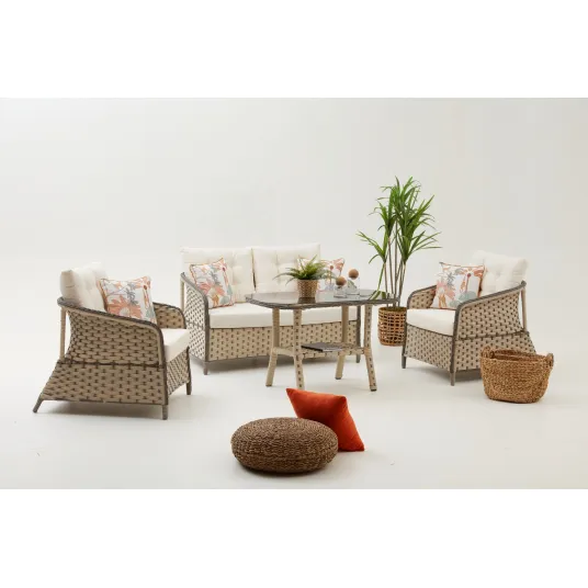 indepartati-Va de relaxare ca niciodata, in timp ce va scufundati in pernele de plus ale canapelelor noastre cu 2 locuri si cu 1 scaune.Dimensiunile generoase ale canapelelor asigura un spatiu suficient pentru tine si cei dragi sa te relaxezi si sa te relaxezi.Tapiteria de culoare crema adauga o nota de eleganta si rafinament in spatiul tau in aer liber, creand o atmosfera linistita care este perfecta pentru relaxare.