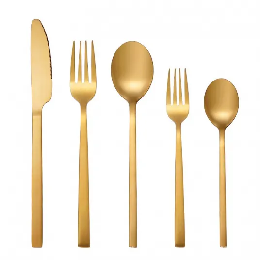 Set de tacamuri de masa format din 5 de piese. Setul de tacamuri este special creat pentru un grad ridicat de confort. Setul este insotitorul optim pentru momente gastronomice perfecte. Tacamurile sunt realizate din otel inoxidabil de cea mai buna calitate. Tacamurile se pot curata la masina de spalat vase. Rasfata-te si ofera-ti un cadou de calitate! Setul de tacamuri de masa de 24 de piese, este special creat pentru un grad ridicat de confort in acelasi timp fiind insotitorul optim pentru momente gastronomice perfecte. Confectionate din inox de calitate superioara, piese din setul de tacamuri format din Cutit de cina, furculita de cina, furculita de desert, lingura de desert, lingura de cina . Setul este elegant si practic remarcandu-se prin design inovator si elegant. Culoare: Auriu Material: Inox