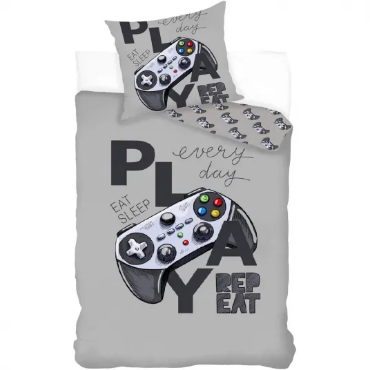 Model: Game Controller Dimensiuni: Husa de plapuma - aprox. 135x200 cm, fata de perna - aprox. 80x80 cm Culori: fata - gri deschis - spate - gri deschis cu imprimare pe tot corpul a controlorului Material: Poliester Ingrijire: Spalare normala si uscare la masina