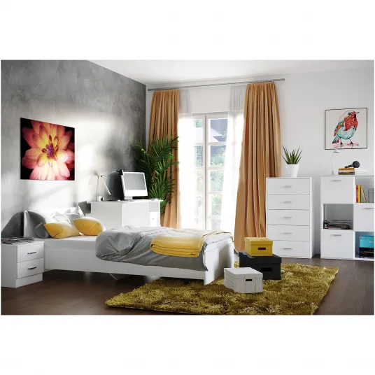Set dormitor Mika Irim, pat 90x200, noptiera, birou, doua comode, alb
