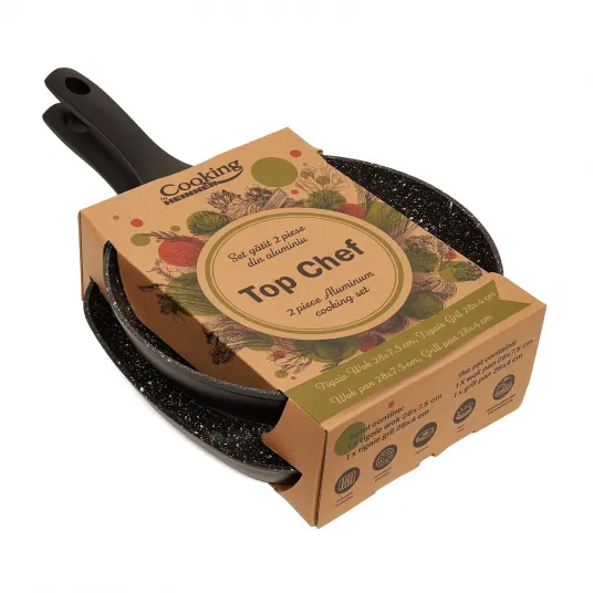 Setul Top chef este realizat din aluminiu forjat cu acoperire Non Stick cu aspect marmorat , facand astfel ca tigaile sa pastreze caldura o perioada mai mare de timp, reducand considerabil timpul de gatire cat si consumul de energie