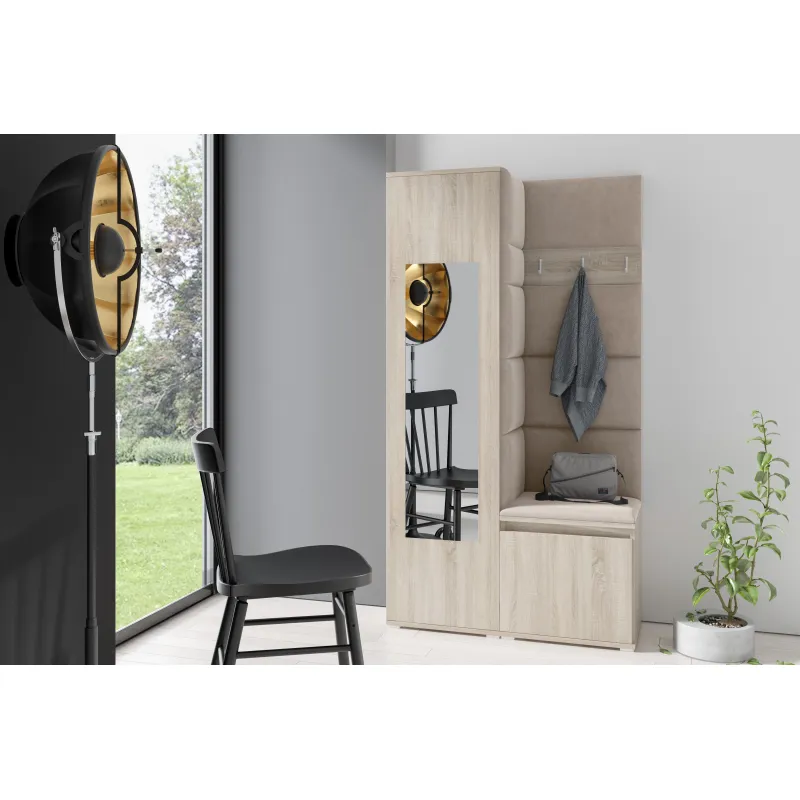 Set mobilier de hol,modern fabricat din pal melaminat 16 mm grosime culoarea stejar sonoma ,canturi abs , feronerie de calitate , si tapitat cu stofa culoarea bej . Inaltime 185 cm x 95 cm latime x 40 cm adancime ! Urmariti in imagini dimensiunile exacte ! Setul include: - dulap cu 1 usa cu oglinda - dulap pantofi cu etajere - 50 cm - 1 cuier (3 carlige), - panouri tapitate; 4 buc 38x30 cm 1 buc 50x40 cm 4 buc 50x30 cm 1 buc 38x15 cm Panourile tapitate se monteaza direct pe perete si in dulap cu lipici. Adezivul rezistent de fixare a panourilor tapitate este inclus in pret , si se gaseste in colete . Panourile trebuie fixate direct pe peretele locuintei dvs si pe placa dulapului ,la fel ca in imagini , in momentul asamblarii , la colturile panourilor turnati putin adeziv din recipient si este fixat rapid . Urmariti si schita de asamblare , usor de asamblat . Se livreaza neasamblat,in colete . Coletele contin tot ce este necesar pentru asamblare .