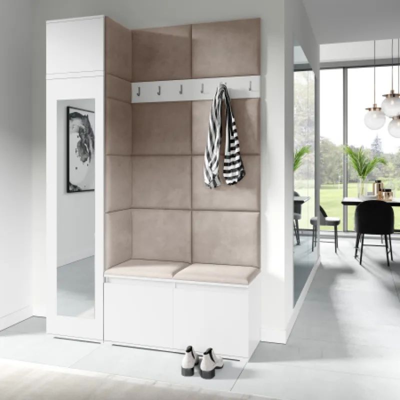 Set hol modern alb,145 cm lungime, cu dulap haine , pantofar si panouri tapitate stofa maro alb, BortisSet mobilier de hol,modern fabricat din pal melaminat 16 mm grosime culoarea alb ,canturi abs , feronerie de calitate , si tapitat cu stofa culoarea maro . Lungime 145 cm x 225 cm inaltime x 40 cm adancime !! Setul include: - dulap cu 1 usa cu oglinda - extensie pentru dulap 45 cm - dulap suspendat - 100 cm - 2 umerase cu 6 carlige, - panouri tapitate; 4 buc 38x40 cm 10 buc 50x40 cm 1 buc 38x15 cm Panourile tapitate se monteaza direct pe perete si in dulap cu lipici. Adezivul rezistent de fixare a panourilor tapitate este inclus in pret , si se gaseste in colete . Panourile trebuie fixate direct pe peretele locuintei dvs si pe placa dulapului ,la fel ca in imagini , in momentul asamblarii , la colturile panourilor turnati putin adeziv din recipient si este fixat rapid . Urmariti si schita de asamblare , usor de asamblat . Se livreaza neasamblat,in colete . Coletele contin tot ce este necesar pentru asamblare .222859380222859380