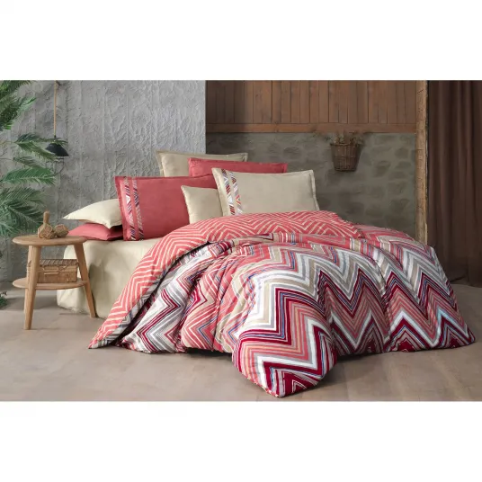 Set lenjerie de pat dublu Maribo, Sarev, Bumbac flanel, 4 piese, Cearsaf plat, Bej multicolor-rosu, 240 x 260 cm