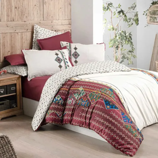 Set lenjerie de pat dublu Saba, Sarev, Fancy Poplin, 4 piese, Bumbac poplin, Cearsaf plat, Rosu, 240 x 260 cm