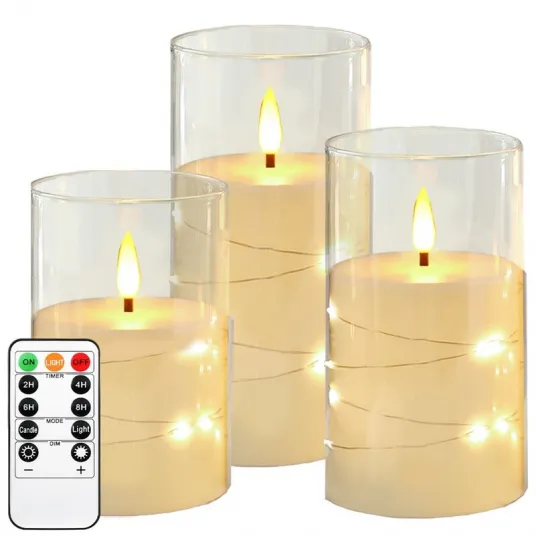 Set Lumanari Electrice LED cu Luminite, Telecomanda si Timer, Imitatie Sticla, Multicolor, 7.5x10/12.5/15cm