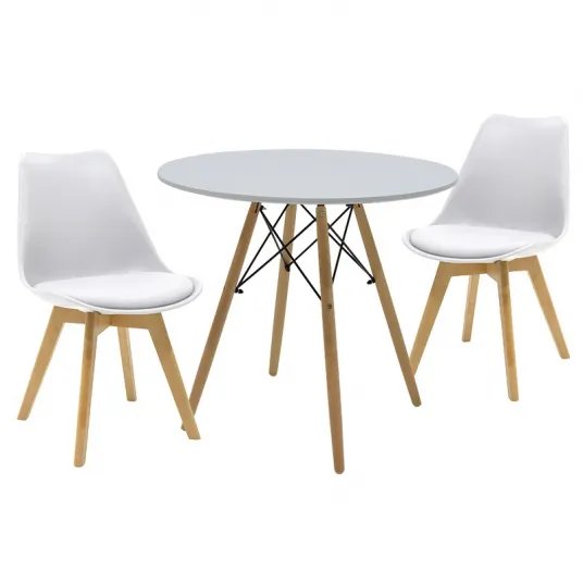 Setul este compus dintr-o masa si doua scaune, toate realizate din materiale de inalta calitate, care asigura durabilitate si confort. Masa are un blat din lemn MDF de 16 mm, cu un finisaj alb satinat, sustinuta de patru picioare din lemn masiv de fag, integrate cu brate metalice rezistente. Scaunele sunt dotate cu spatar din polipropilena si sunt acoperite cu piele ecologica PU, oferind un confort sporit si o usurinta in curatare.
