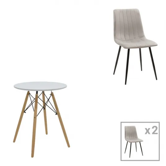 Setul include o masa si trei scaune, toate realizate din materiale de inalta calitate. Masa are un blat din lemn MDF de 16mm, vopsit in alb, ce asigura rezistenta si durabilitate. Picioarele din lemn, reinfortate cu elemente metalice in culoarea naturala, confera stabilitate si un aspect elegant si modern. In plus, capacele de plastic de la capetele picioarelor protejeaza podeaua de zgarieturi si uzura.